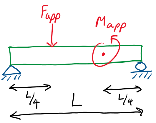 This video describes how to handle a discontinuity in a force applied transversely at a point along a beam and how to handle a concentrated moment applied at a point along a beam. There is an example of a pinned-pinned beam with an applied moment halfway along the beam. The question involves solving for the maximum bending moment along a beam with both an applied force and an applied moment as shown below.