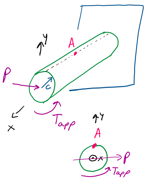 Determine the shear stress τxz at location A, which is along the most y-positive line on the surface of the loaded cylinder. Tapp is in the positive x-direction, and P is in the negative z-direction.